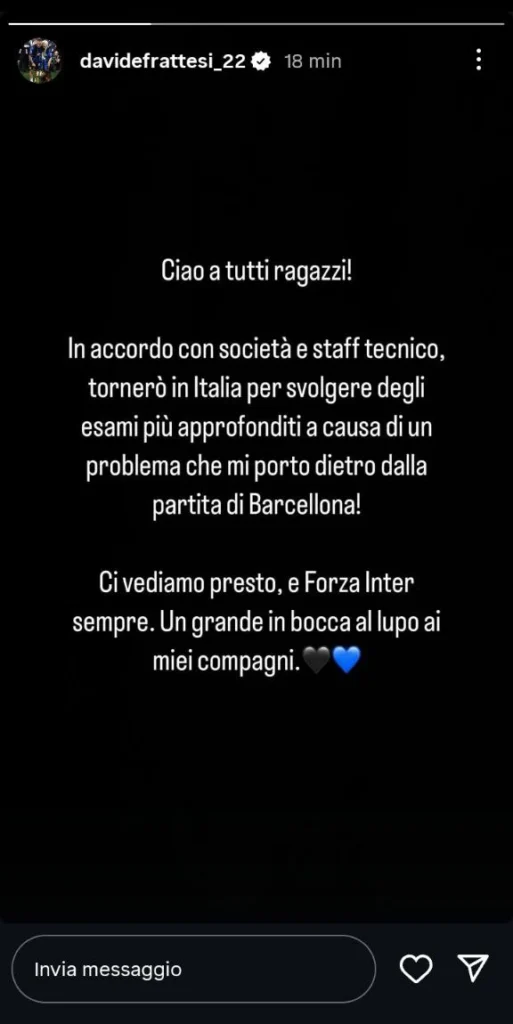 “Ciao a tutti ragazzi, in accordo con società e staff tecnico tornerò in Italia per svolgere esami più approfonditi a causa di un problema che mi porto dietro dalla partita di Barcellona. Ci vediamo presto, e forza Inter sempre. Un grande in bocca al lupo ai miei compagni”.