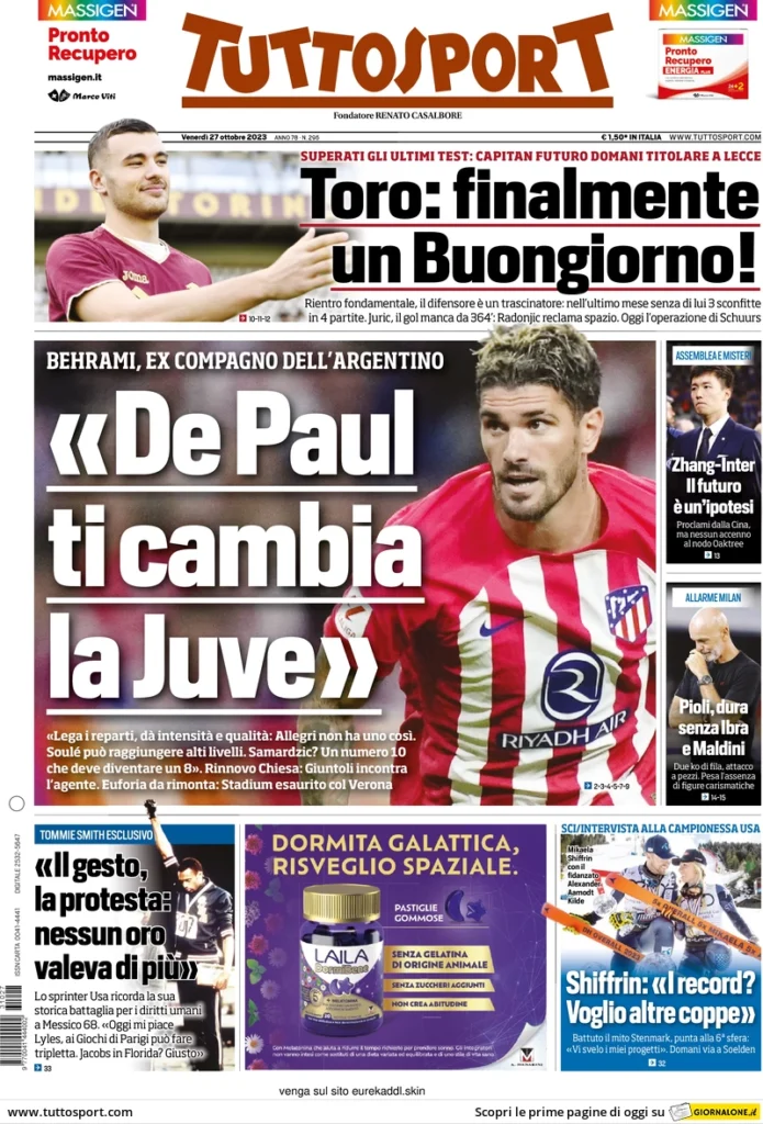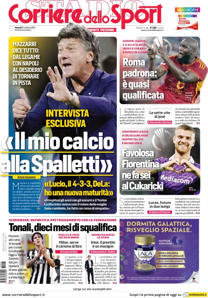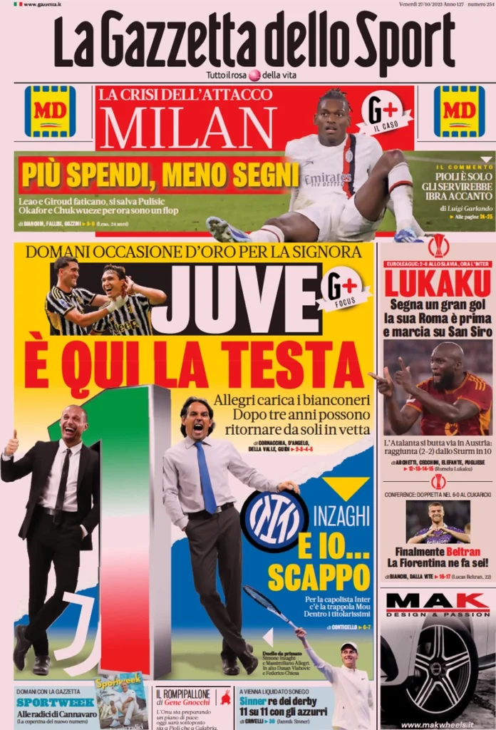 INTER PRIME PAGINE QUOTIDIANI SPORTIVI OGGI 27 OTTOBRE - Le prime pagine dei principali quotidiani sportivi italiani di oggi, venerdì 27 ottobre 2023. Di seguito i titoli più importanti.