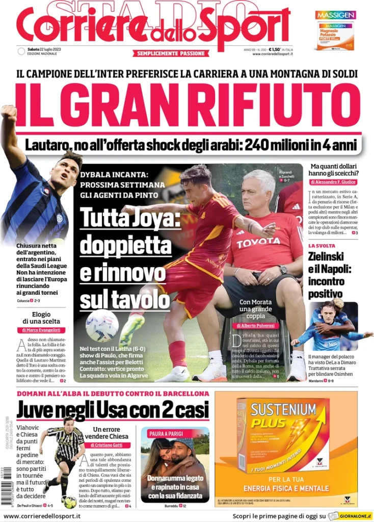 PRIME PAGINE QUOTIDIANI SPORTIVI OGGI 22 LUGLIO - Sabato 22 luglio. Di seguito le prime pagine dei principali quotidiani sportivi nazionali oggi in edicola con i titoli sull'Inter di Simone Inzaghi.