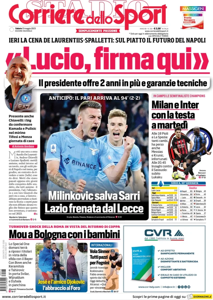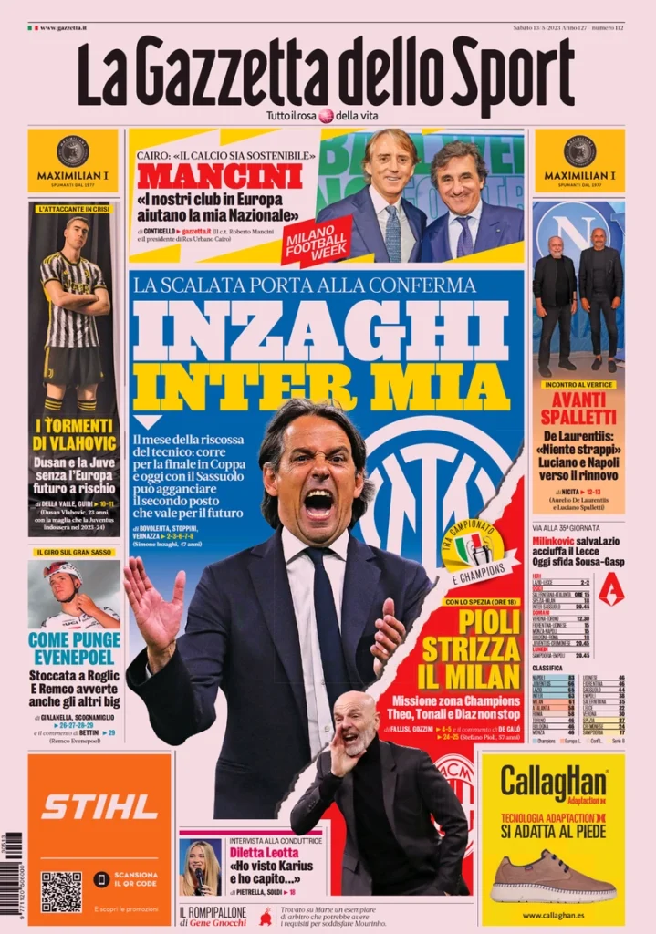 PRIME PAGINE QUOTIDIANI SPORTIVI OGGI 13 MAGGIO - Di seguito le prime pagine dei principali quotidiani sportivi nazionali oggi in edicola, sabato 13 maggio, coi titoli sull'Inter di Simone Inzaghi.