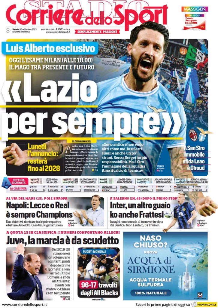 PRIME PAGINE QUOTIDIANI SPORTIVI OGGI 30 SETTEMBRE - Sabato 30 settembre. Ecco di seguito i titoli di oggi sull'Inter e le prime pagine dei maggiori quotidiani sportivi in edicola oggi.